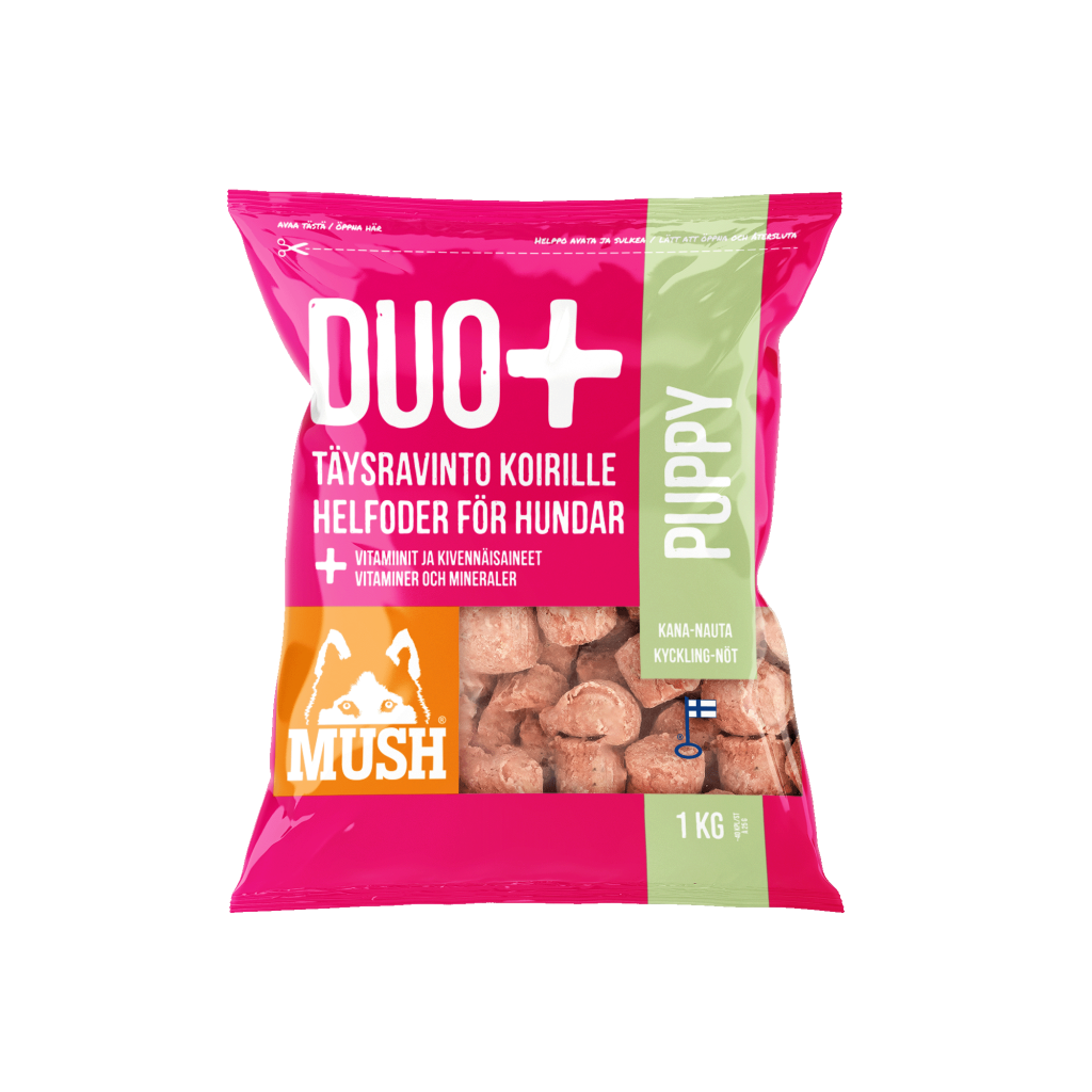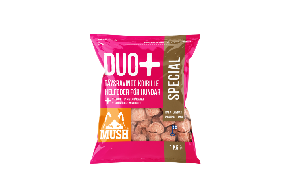 MUSH DUO+ Special (kana-lammas) on täysravinto, joka sopii kaikille koiraroduille. Sisältää luuta 9%, maksaa 5% Saatavilla 1kg pakkauksessa Tuotetta myydään lemmikkieläinliikkeissä, sekä K-ryhmän päivittäistavarakaupoissa.