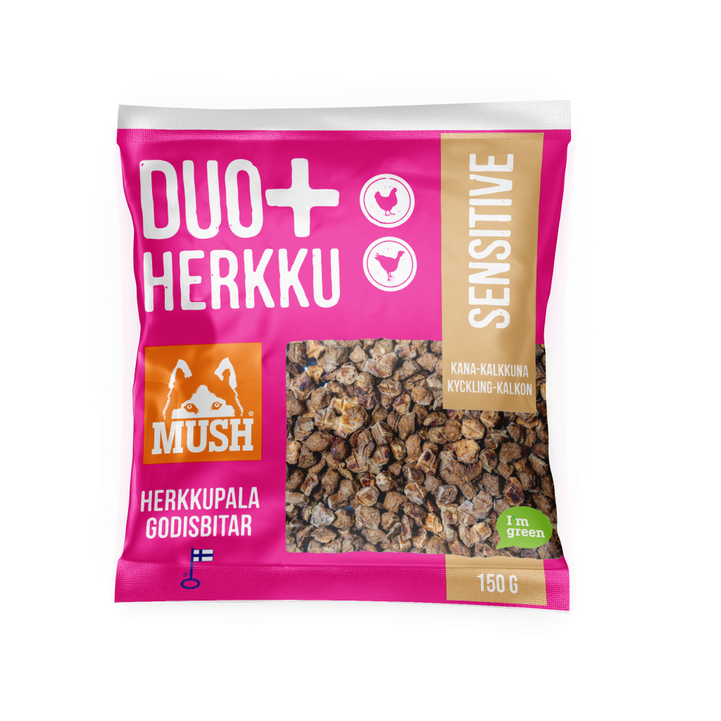 DUO+ Herkku SENSITIVE kana-kalkkuna on vitaminoitu herkkupala kaikille koirille. Pienet palat sopivat herkuttelun lisäksi hyvin mm. koulutusnameiksi. Sisältää luuta 8 % ja maksaa 5 % Saatavilla 150g pakkauksissa Tuotetta myydään lemmikkieläinliikkeissä, sekä S- ja K-ryhmän päivittäistavarakaupoissa.