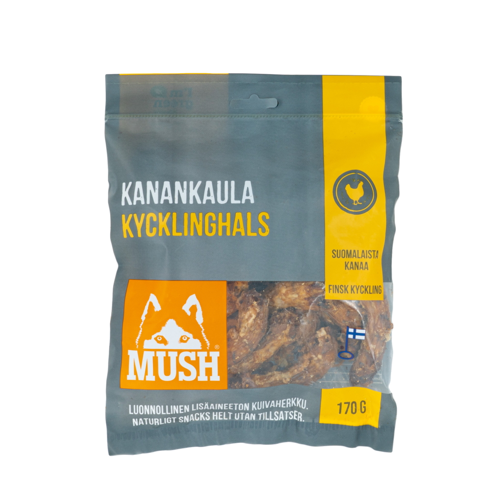 MUSH VAINU® kanankaulat ovat ihanan rapeaksi kuivattuja herkkuja, jotka on kätevä tarvittaessa pilkkoa pienillekin lemmikeille sopiviksi suupaloiksi.