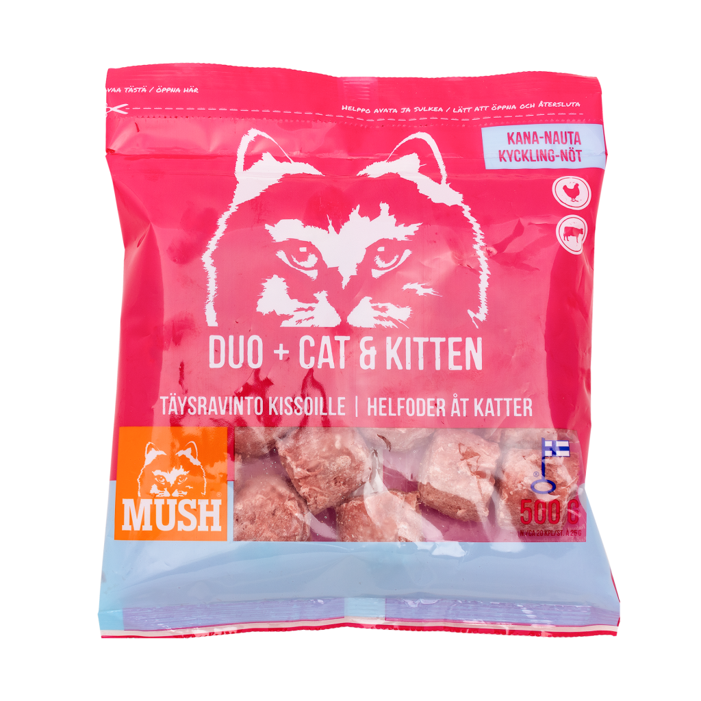 MUSH DUO+ CAT&KITTEN® Kana-nauta on täysravintomme kissoille.