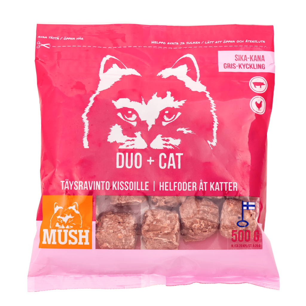 MUSH DUO+ CAT® on vitaminoitu täysravintomme kaikille kissoille, joka on kehitetty sinulle joka haluat antaa kissallesi lajityypillistä ruokaa.